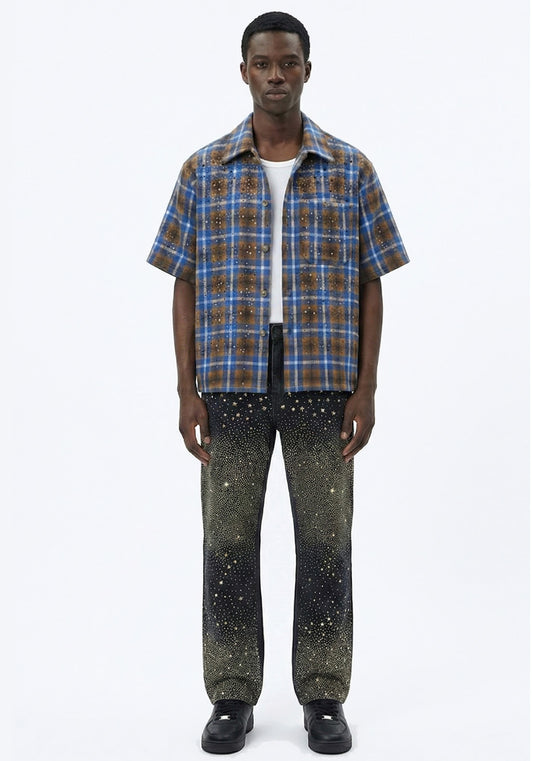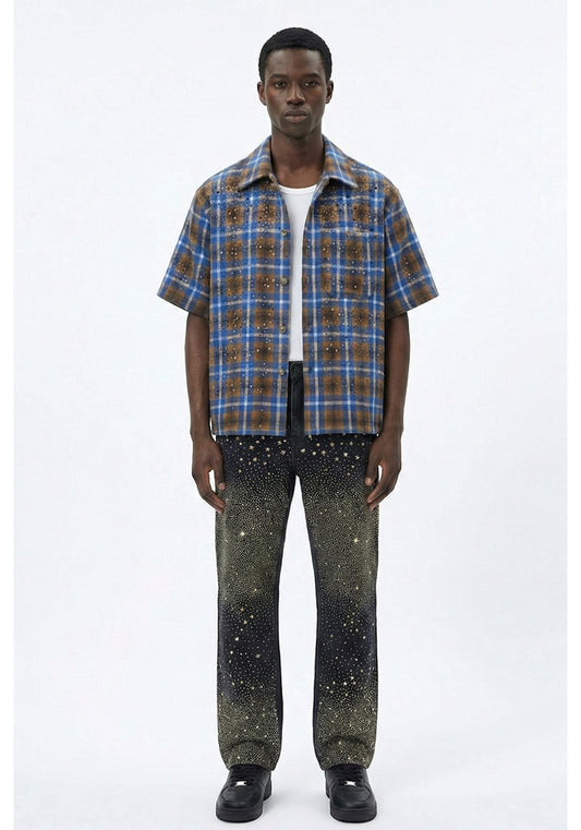 Speckled Plaid Short-Sleeve Shirt Blue